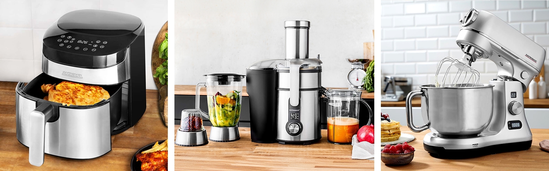 Die Küchengeräte von Gastroback sind perfekt für den alltäglichen Gebrauch. Bereiten Sie Ihre gesunden Smoothies mit dem Design Multi Juicer Digital zu oder entdecken Sie die Vielfalt der Design Küchenmaschine Advanced Digital. Gastroback überzeugt mit hochwertigen Design und guter Qualität.
