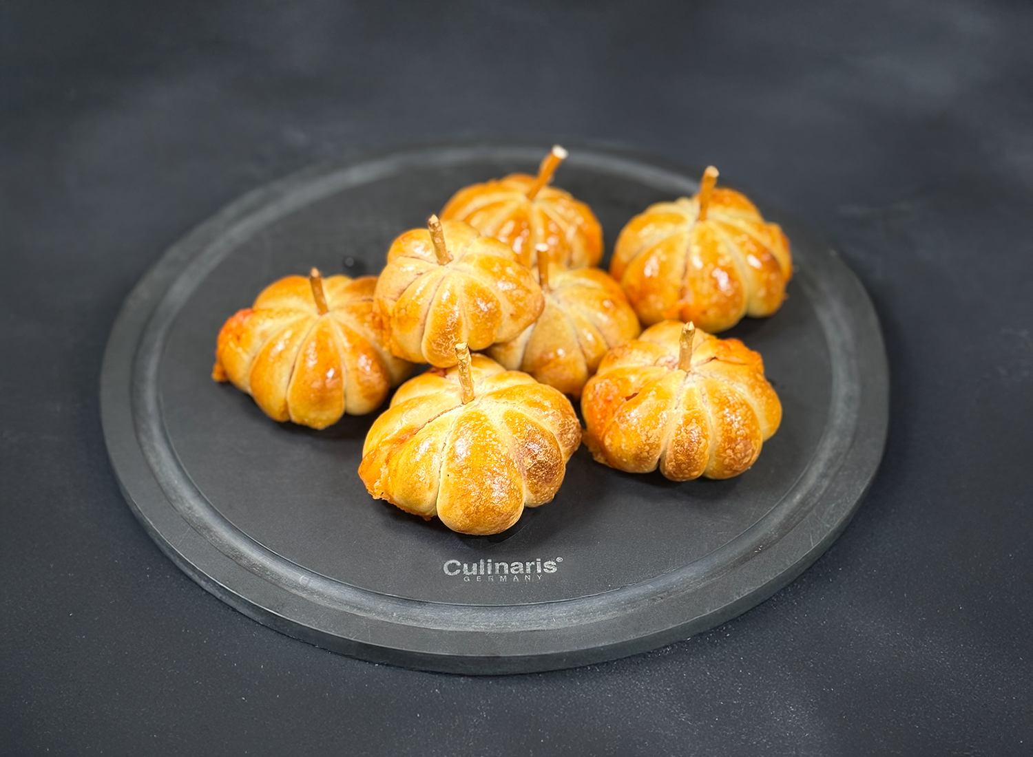 Die geformten Kugeln anschließend auf ein mit Backpapier belegtes Blech legen und mit verquirltem Eigelb bestreichen und im vorgeheizten Ofen backen, bis sie goldbraun sind. Nach dem Backen die Fäden vorsichtig entfernen. Für den Kürbisstiel eignet sich eine Salzstange oder ein Basilikumblatt.