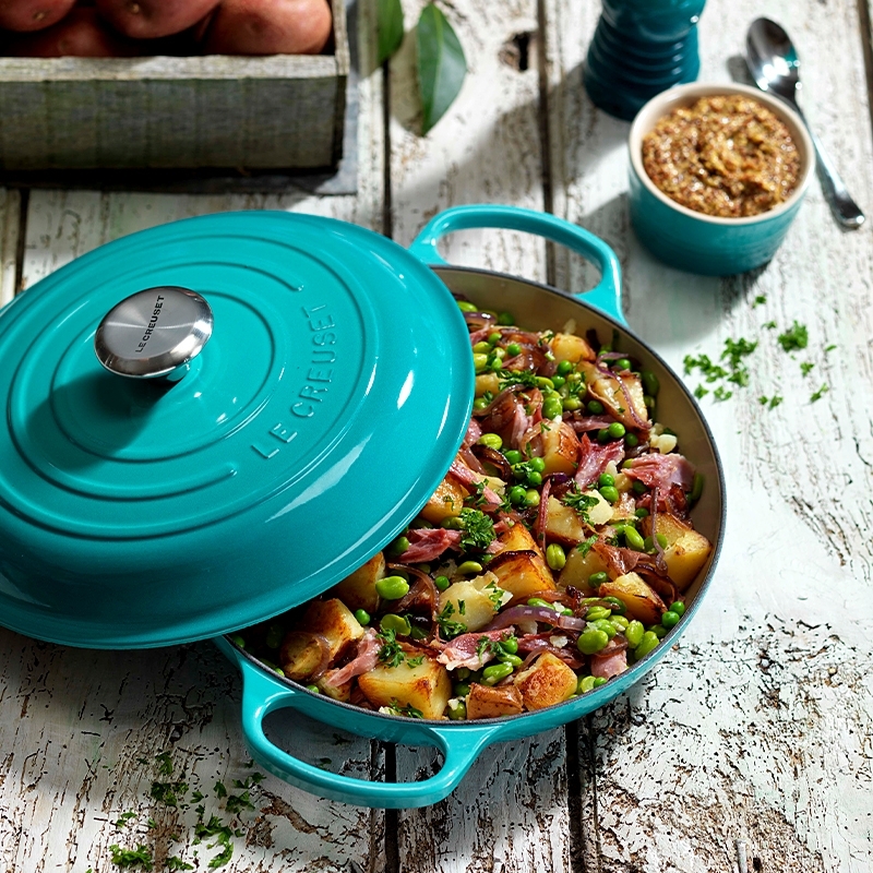 Die Le Creuset Spezial-Bräter bestechen durch ihre diversen Formen und die vielseitigen Einsatzmöglichkeiten. Die farbenfrohen Bräter eignen sich darüber hinaus perfekt zum Servieren am Tisch: Zum einen ist Gusseisen ein hervorragender Wärmespeicher, so dass der Nachschub im Bräter lange warm bleibt und zum anderen lassen sich die bunten Farben sehr gut in eine festlich geschmückte Tafel integrieren.