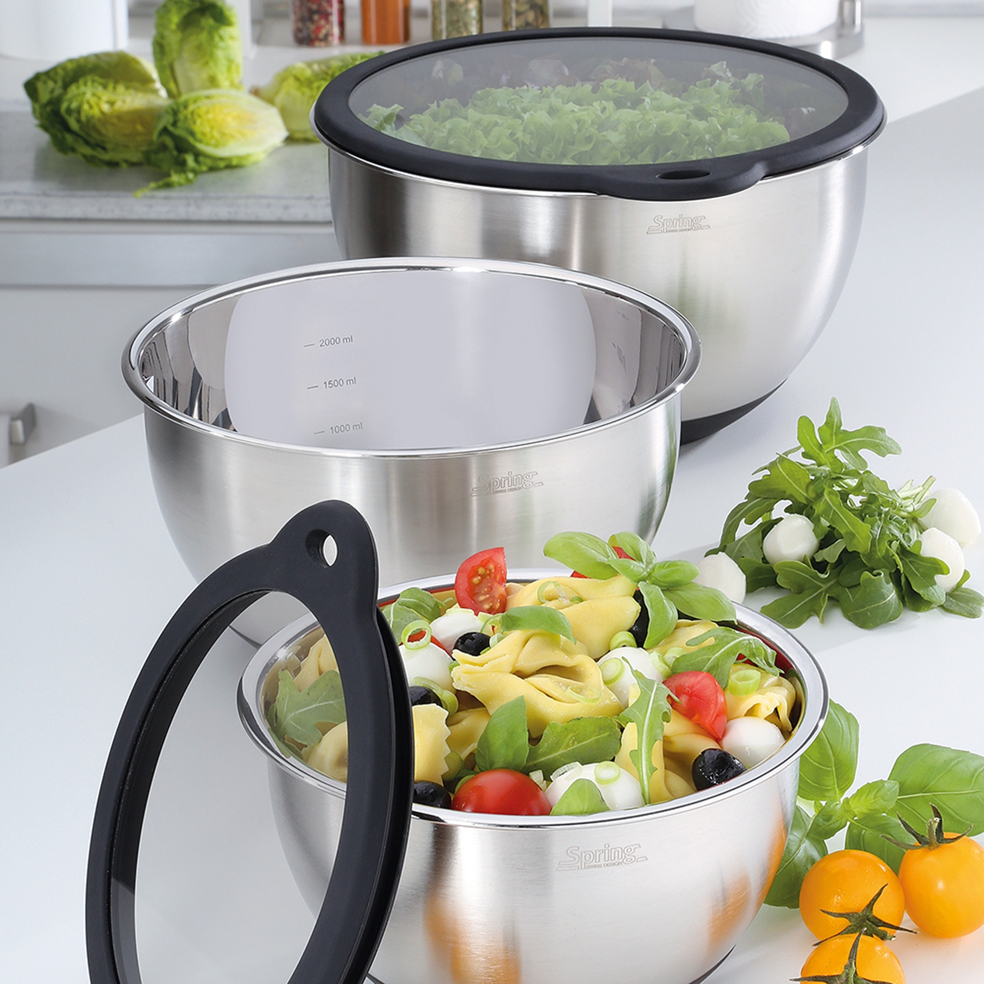 Spring - Schüssel-Set 3-teilig mit Glasdeckel FUSION2+ - Die Schüsseln aus Edelstahl sind hitzebeständig, kälteresistent rutschfest.