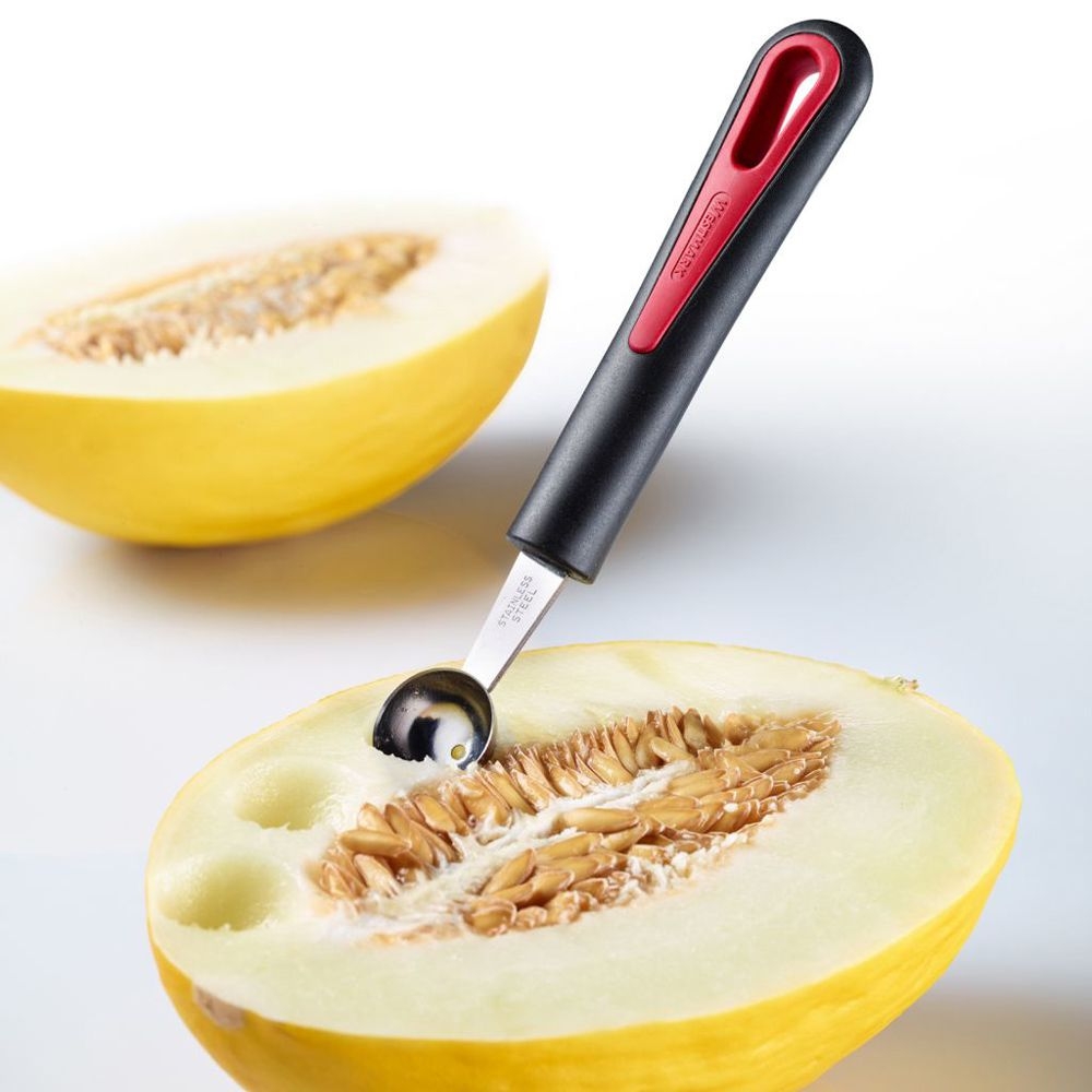 Der Aushöhl-Löffel der zuverlässigen Küchenhelfer-Serie "Gallant" eignet sich sowohl zum Aushöhlen und -schaben von Obst und Gemüse wie Äpfeln, Zucchini oder Auberginen, als auch zum dekorativen Formen von Obst- und Gemüse-Kugeln für süße und herzhafte Salate und andere Speisen. Er ist auch zum Formen von Butter-Kugeln geeignet.
