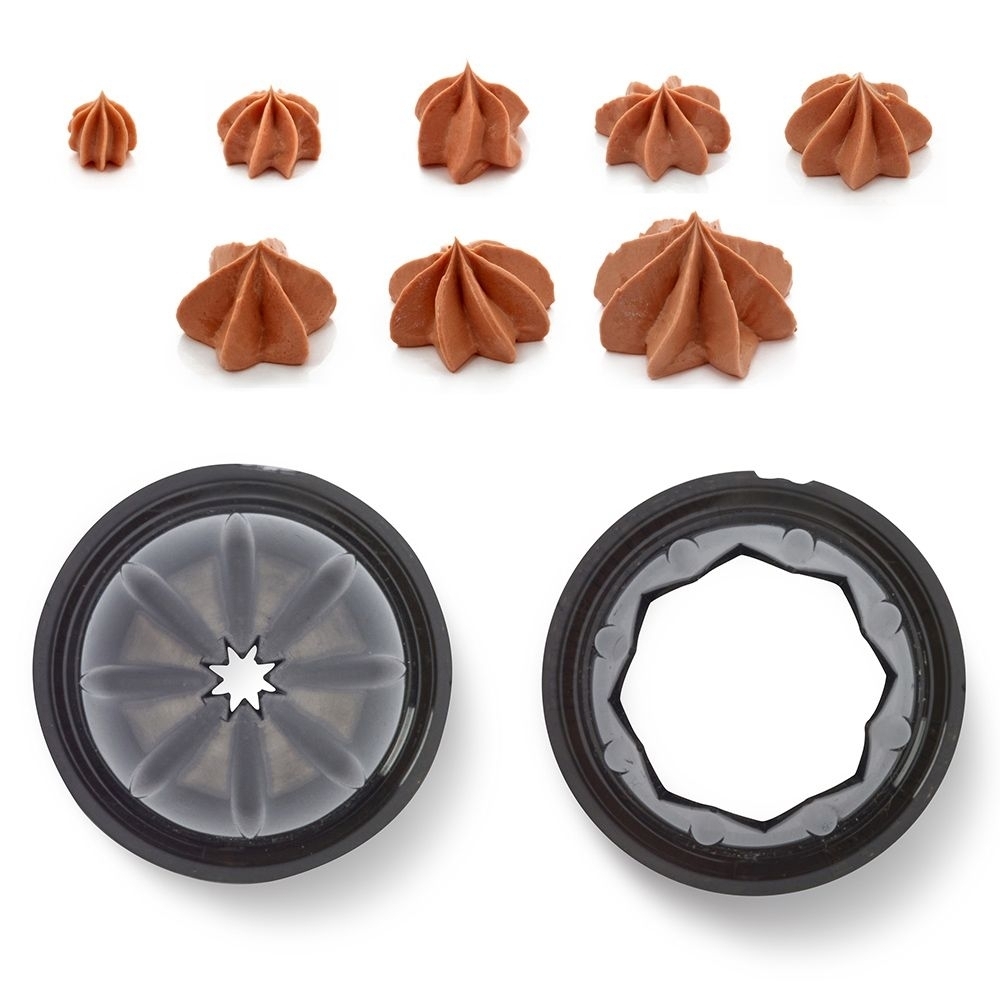 Gebäckdüsen aus TRITAN. Perfekt glatter Kegel für garantierte Hygiene. Die verstärkten Zähne an den ausgefallenen Düsen sorgen für hohe Genauigkeit. Die Düsen sind lang genug, damit sie leichter in die Tasche gesteckt werden können und sie besser sichtbar sind. Sie alle passen zu LE TUBE von de Buyer und sind spülmaschinenfest.