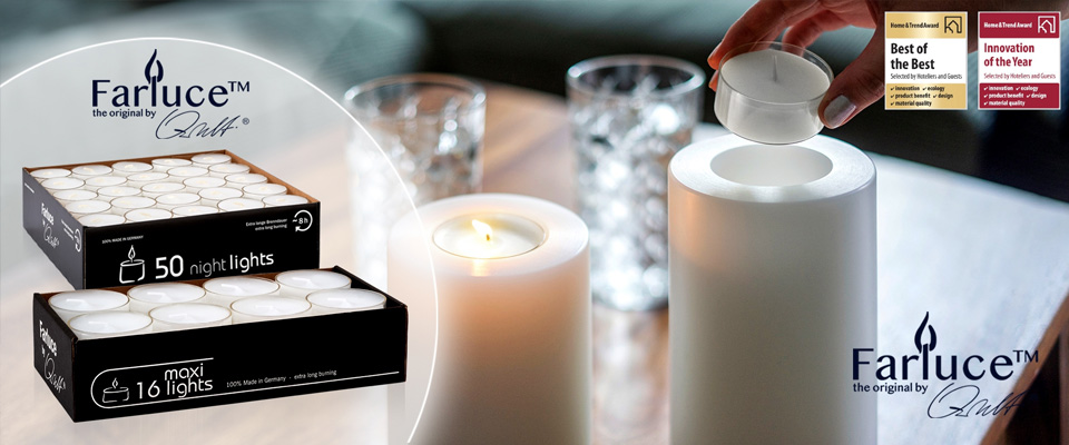 The FARLUCE™ Qult tea light holders are unique and stand for the highest quality, economy and safety. They are 100% produced in Germany.