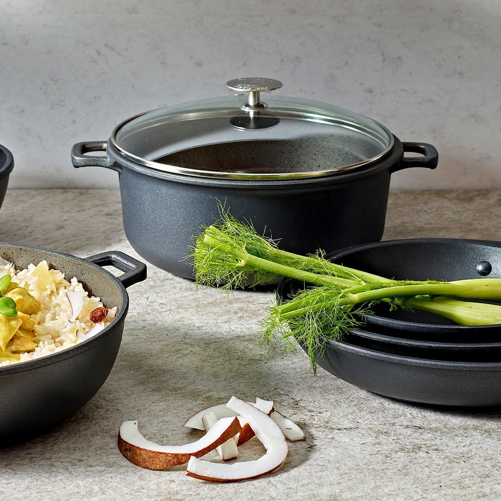 A range made of thick aluminium with PFOA-free PTFE 5-layer coating. A professional non-stick range made with thick aluminium with high quality, multi-layer, non-stick coating. Ideal for gentle and delicate cooking, slow cooking, heating and warming up dishes. Made in France.