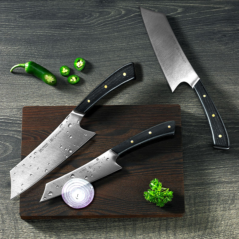 Grind it over special wet grinding stones, never pull it over a sharpening steel or let it down from a grinder. Regular scraping over the stone guarantees a very good sharpness and fun when cooking. Traditionally, the highest quality Japanese knives are not stainless. Always make sure that your knives are never wet.