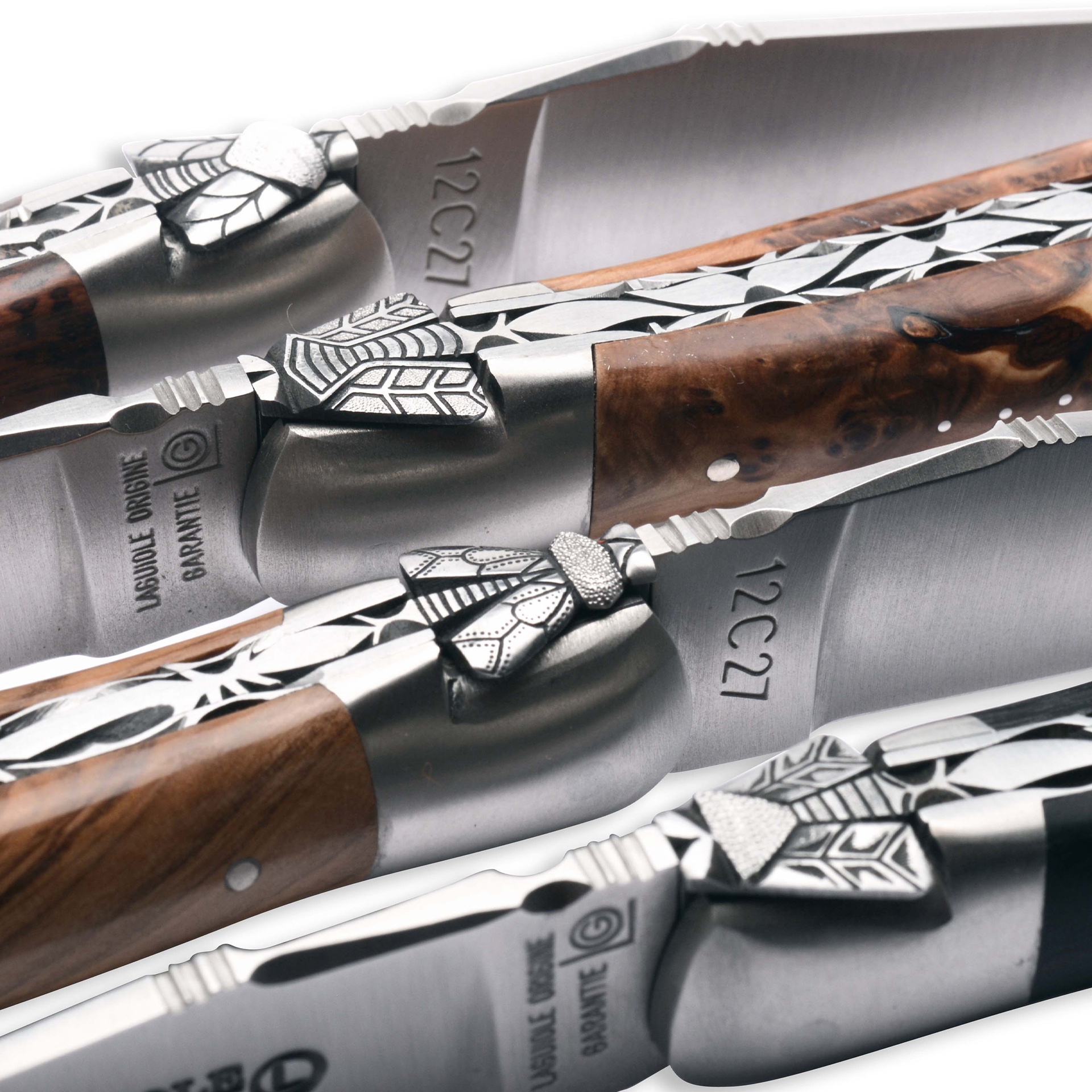The first "Laguiole" was made of bone or horn (the hardest materials available at the time). You can see how much has changed in the way the materials are used. In the beginning, bone and horn were mainly used for processing, but today, among other things, fine woods from all over the world are used. Instead of ivory, mammoth ivory is used today to protect the living animals.