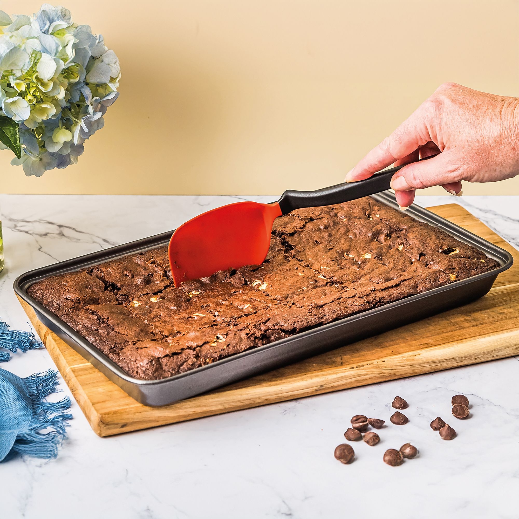 The clever curve of the Mini Chopula handle holds the head up off the work surface to keep it clean and germ-free. The small, flexible head slides easily under food for easy lifting - perfect for biscuits, eggs and brownies. The angled handle and multi-curved head reach every corner of pans and trays, keeping hands away from food and heat. The durable, heat-resistant nylon head can be used on any surface without scratching non-stick cookware.