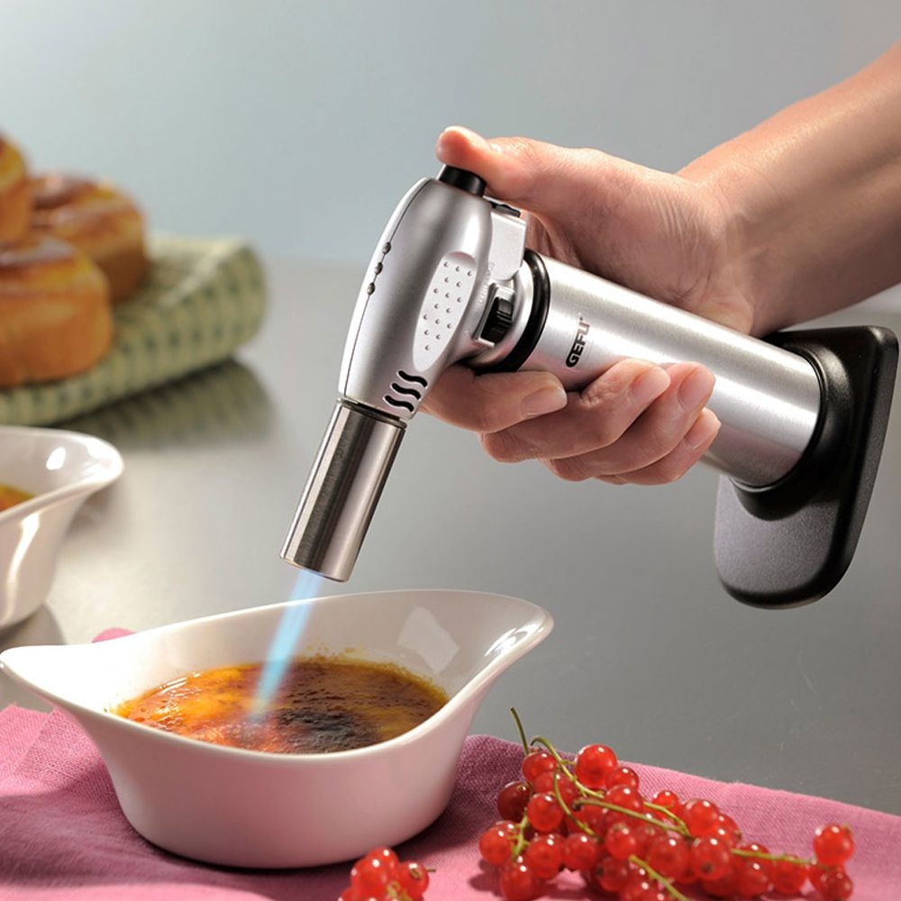 For a perfect crème brûlée, the flambé burner FUEGO is an indispensable kitchen helper. Thanks to the infinitely variable flame control up to 1300°C, it can also be used to skin peppers or tomatoes or to transform the white egg whites on desserts or cakes into a delicate brown crunch. It is operated with commercially available lighter gas and has a burn time of up to 60 minutes. With its practical stand, it finds its place in every kitchen.