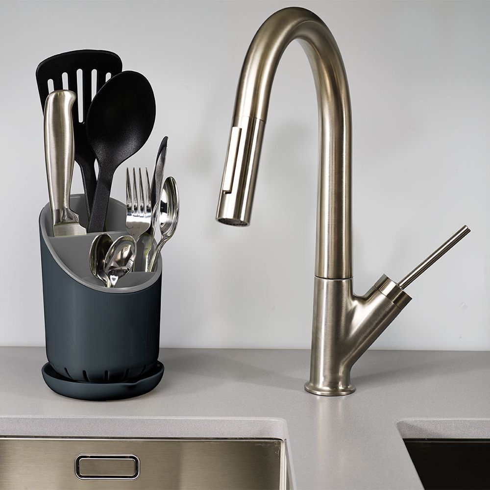 This handy Joseph Joseph cutlery drainer features tiered compartments to help you separate different pieces and an integrated saucer to collect excess water.