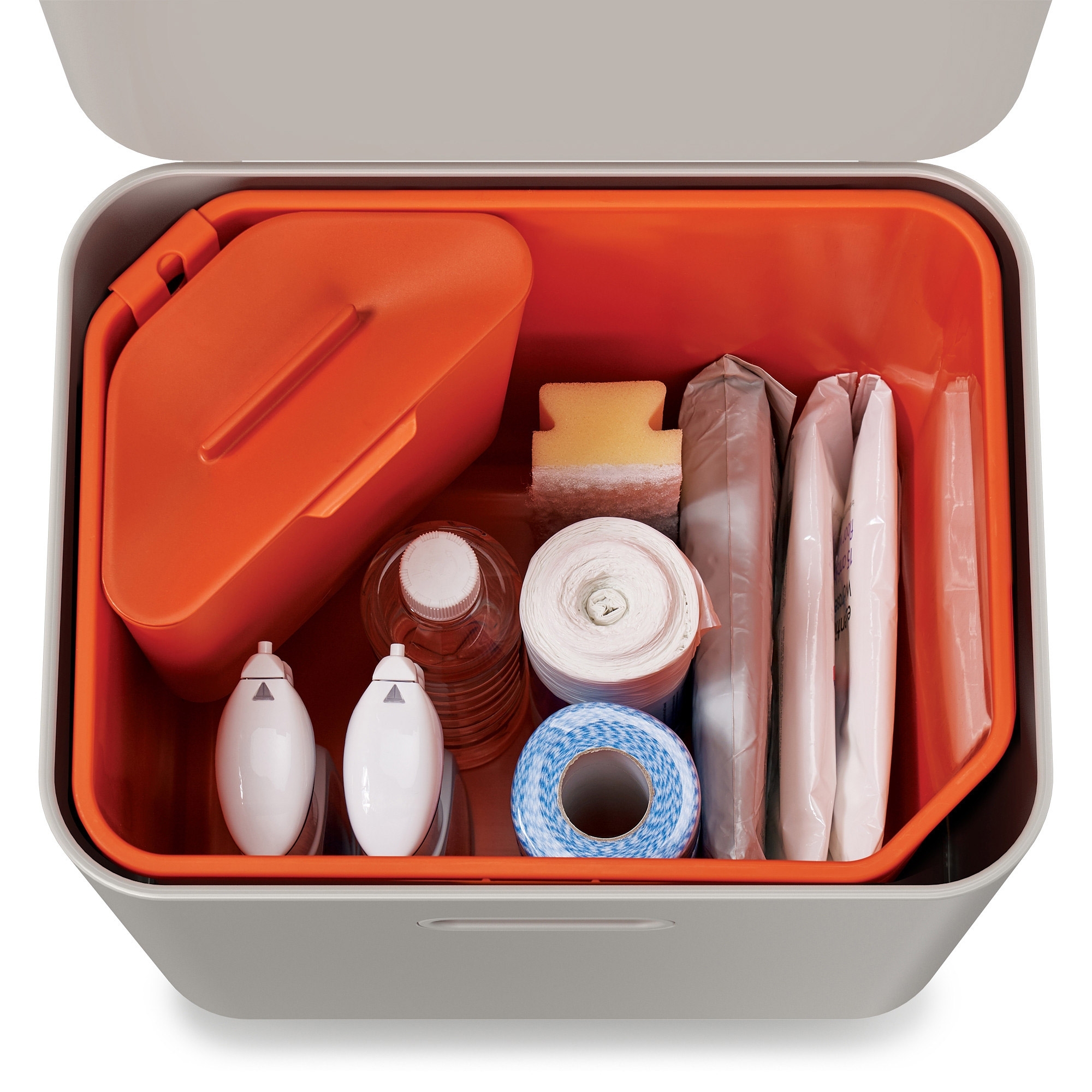 - Removable compartments with bag-holding holes and hooks for carrier bags make emptying easy
