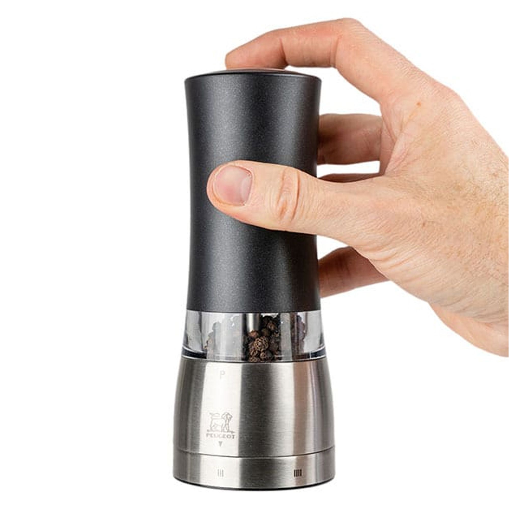 The 16cm Daman u'Select Electric Pepper Mill features a beautiful satin black finish that perfectly matches the stainless steel base. The practical and elegant grinder is easy to use thanks to the button on the top and offers very precise grinding level adjustment. Its modern, compact design fits harmoniously into any kitchen.